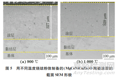 由圖5可知,用不同溫度燒結(jié)粉體制備的(MgCoNiCuZn)O陶瓷涂層截面均具有典型的層狀結(jié)構(gòu),同時(shí)涂層中存在少許孔洞,這是大氣等離子噴涂制備涂層的組織特征。由表2結(jié)合圖5可以看出,用900,1000℃燒結(jié)粉體制備的陶瓷涂層的厚度和孔隙率差別較小。與用900℃燒結(jié)粉體制備的陶瓷涂層相比,用1000℃燒結(jié)粉體制備的陶瓷涂層與基體的結(jié)合強(qiáng)度提高了6.2%,維氏硬度提高了9.6%,這與用1000℃燒結(jié)粉體制備的陶瓷涂層更加嚴(yán)重的晶格畸變有關(guān)。