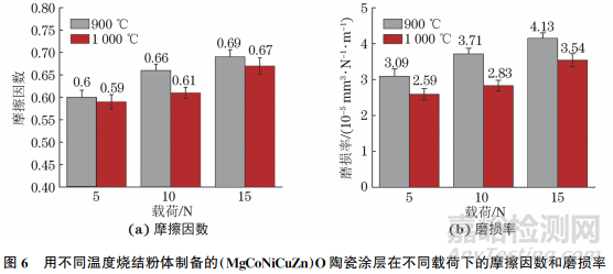 (3)(MgCoNiCuZn)O高熵氧化物陶瓷涂層的摩擦學(xué)性能優(yōu)良,摩擦因數(shù)在0.59~0.69,磨損率在2.59×10-5~4.13×10-5mm3·N-1·m-1,主要磨損機(jī)理為磨粒磨損和疲勞剝落。與用900℃燒結(jié)粉體制備的陶瓷涂層相比,用1000℃燒結(jié)粉體制備的陶瓷涂層具有較低的摩擦因數(shù)與磨損率,磨損表面的犁溝細(xì)而淺,剝落坑小而少。