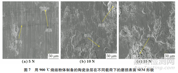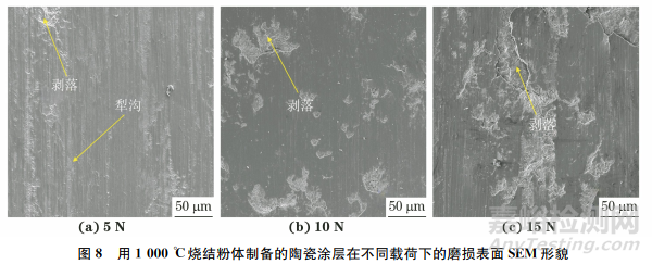 由圖7和圖8可知:在5N載荷下2種涂層的磨損表面均較為光滑,僅存在淺犁溝和極少量剝落坑,說明涂層發(fā)生了微弱的磨粒磨損和疲勞剝落,因此該載荷下涂層的摩擦因數(shù)和磨損率均最??;當(dāng)載荷增大到10N時(shí),磨損表面變得粗糙,剝落坑增多;當(dāng)載荷繼續(xù)增大到15N時(shí),磨損表面的剝落坑數(shù)量更多,剝落的面積更大。這是因?yàn)殡S著載荷的增大,摩擦力增大,磨損時(shí)表面的接觸應(yīng)力和塑性變形隨之變大,加之磨損表面粗糙度增大,因此摩擦過程中的剝落程度增大,涂層的摩擦學(xué)性能變差。與用900℃燒結(jié)粉體制備的陶瓷涂層相比,用1000℃燒結(jié)粉體制備的陶瓷涂層磨損表面的犁溝細(xì)而淺,剝落坑小而少,這是由于嚴(yán)重的晶格畸變使得該涂層更利于剪切并具有較好的力學(xué)性能所致。