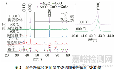 試驗(yàn)原料為純度為99.5%的MgO粉體、NiO粉體、CuO粉體、ZnO粉體和純度為99.5%的CoO粉體。按照金屬元素原子比1∶1∶1∶1∶1稱取上述5種氧化物粉體,放入行星式球磨機(jī)中,以酒精為介質(zhì)進(jìn)行濕法球磨混合,球料質(zhì)量比為8∶1,球磨時(shí)間為12h,轉(zhuǎn)速為300r·min-1。將混合好的粉末烘干后裝入坩堝,放入馬弗爐中進(jìn)行高溫固相反應(yīng)燒結(jié),燒結(jié)溫度分別為700,800,900,1000℃,保溫時(shí)間為12h。保溫結(jié)束后在空氣中快速冷卻,再進(jìn)行機(jī)械破碎和研磨過篩,得到(MgCoNiCuZn)O陶瓷粉體。