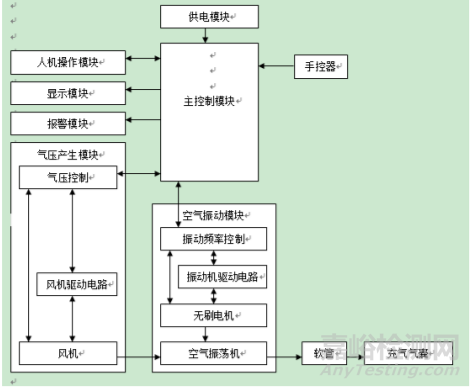 圖1 氣動(dòng)脈沖振蕩排痰設(shè)備的工作原理和電氣連接圖