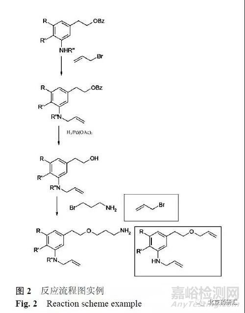 在工藝中,存在某些殘留物可能殘留在中間體中的可能性。對(duì)于這些化合物,在隨后的工藝步驟中具有高概率的反應(yīng),例如,在合成早期考慮使用烷基鹵,另一個(gè)烷化劑應(yīng)在下游工藝中使用,則早期使用的烷基鹵殘留很可能消耗在后面階段,見圖2。該工藝中,第一階段用到的烯丙基溴殘留到第三階段,如果仍然存在,將反應(yīng)生成預(yù)期產(chǎn)物的烯丙基類似物。