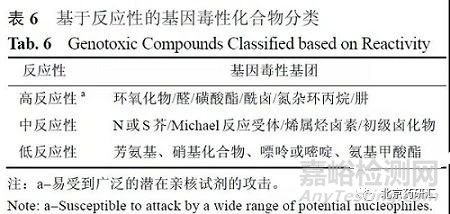 基因毒性化合物的反應(yīng)活性可按表6 分類,該表只作為一個(gè)參考,具體情況應(yīng)根據(jù)實(shí)際工藝的化學(xué)反應(yīng)來評(píng)估。