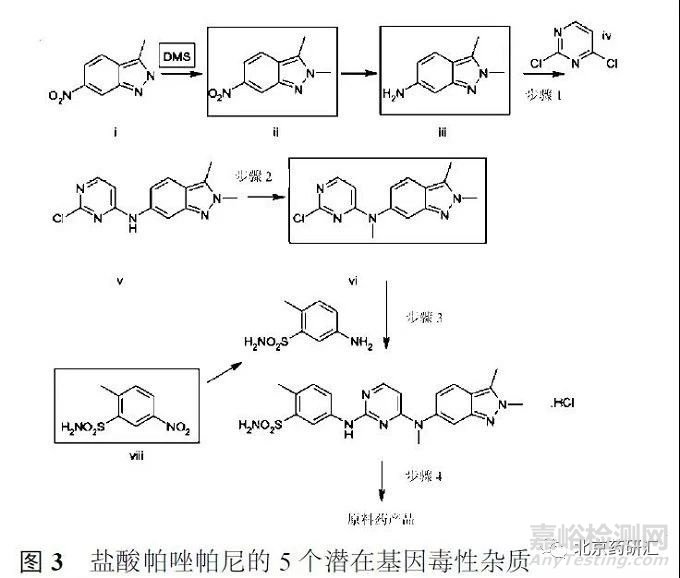 一種新型的抗肌瘤產(chǎn)品,鹽酸帕唑帕尼的5 個(gè)潛在基因毒性雜質(zhì)的分析控制策略見圖3(基因毒性雜質(zhì)用盒括標(biāo)識(shí))。