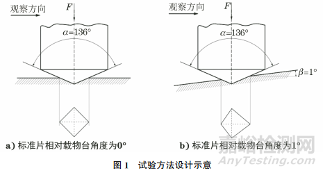 試驗(yàn)方法設(shè)計(jì)如圖1所示。圖中α為壓頭對角線角度;β為試樣測試表面與載物臺角度;F為載荷。