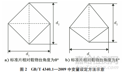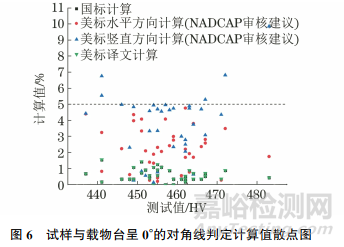 (2)滿足GB/T 4340.1—2009與ASTME 92—2017的要求時(shí),對于一些對角線長度差異不大,但是壓痕不規(guī)則的測試點(diǎn),NADCAP審核建議的美標(biāo)判定更為嚴(yán)謹(jǐn)。