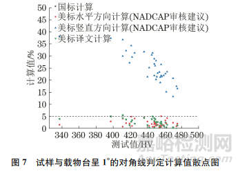 試樣與載物臺呈1°時(shí),按國標(biāo)判定,僅2點(diǎn)不滿足要求,美標(biāo)譯文挑出3點(diǎn)不符合要求,而NADCAP審核建議中美標(biāo)的對角線判定規(guī)則將對角線豎直方向均判定為不滿足誤差要求,可以得出壓頭在豎直方向與試樣表面不平行的結(jié)論。