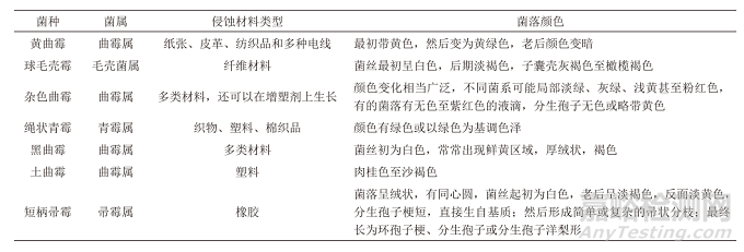 從表1可以看到,在產(chǎn)品所使用的有機(jī)材料能夠作為霉菌營養(yǎng)物質(zhì)的情況下,產(chǎn)品材料將會被分解,并導(dǎo)致產(chǎn)品損壞。由于不同霉菌的特性(如所需的營養(yǎng)物質(zhì)、分解材料的原理等)存在差異,使得不同霉菌能夠侵蝕的材料類型也有所不同。GJB150.10A-2009 《國家軍用標(biāo)準(zhǔn)環(huán)境試驗(yàn)方法——霉菌試驗(yàn)方法》被廣泛應(yīng)用于電連接器的霉菌試驗(yàn)中,表2整理了GJB150.10A中涉及到的霉菌類型和特點(diǎn)。