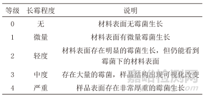 GJB150.10A以0~4級五個等級描述樣品霉菌試驗(yàn)結(jié)果的好壞,具體的評定方法見表3。
