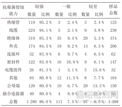 2)在所有類別中,抗霉菌侵蝕能力較差的樣品占比最高的為電纜組件,為15.6%。電纜組件的功能是固定和支撐電連接器中的線纜,其材質(zhì)多為單一的塑料。導(dǎo)致電纜組件出現(xiàn)嚴(yán)重霉菌侵蝕結(jié)果比例最大的原因可能是,當(dāng)電纜組件表面的抗霉涂層質(zhì)量較差,或在生產(chǎn)、運(yùn)輸、試驗(yàn)過程中出現(xiàn)劃損后,其核心材質(zhì)塑料直接暴露在霉菌環(huán)境中,而這類材料又能夠作為霉菌的營養(yǎng)物質(zhì),易被霉菌直接侵蝕,從而導(dǎo)致大面積的霉菌生長結(jié)果;