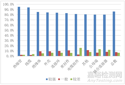 1)在所有類別中,抗霉菌侵蝕能力較強(qiáng)的樣品占比最高的為熱縮管和線纜,分別為95.2%和94.1%。并且這兩個類別中抗霉菌侵蝕能力一般和較差的樣品占比為所有類別中也是最低的。因此熱縮管和線纜在所有類別樣品中,抗霉菌侵蝕能力最佳。這說明在抗霉菌侵蝕方面,當(dāng)前電連接器所使用的熱縮管和線纜的生產(chǎn)工藝上已比較成熟;