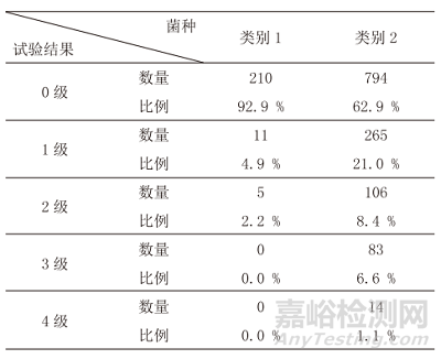 1)67.5%的樣品長霉等級為0級,18.5%的樣品長霉等級為1級,即86.0%(67.5%+18.5%)的樣品在試驗(yàn)結(jié)束后,完全不長霉或僅有微量霉菌生長。這說明有86.0%的樣品具有較好的抗霉菌侵蝕能力;