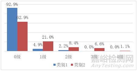 2)長霉等級為1級和2級的樣品在類別1中占比分別為4.9%和2.2%,比在類別2中的占比(21.0%和8.4%)少了16.1%和6.2%;