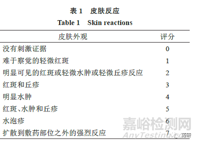 在誘導期和激發(fā)期,申請人應根據(jù)量表(表1、2)對受試者皮膚反應進行評分。