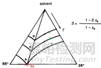 結(jié)論1拆分效率轉(zhuǎn)化公式:操作點(diǎn)停留在共組分點(diǎn)e (Eutectic Composition)時(shí),可以得到光學(xué)純度OP=1的異構(gòu)體SR*,且此時(shí)SR*收率最高。根據(jù)定義拆分效率S=OP(光學(xué)純度)*Y(收率),那結(jié)晶操作停留在e點(diǎn),即為最優(yōu)拆分效率,根據(jù)物料衡算得出拆分效率S的計(jì)算公式如下,xe為目標(biāo)難溶組分SR*在溶液中的組成: