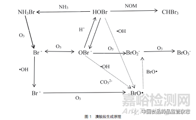 O3 作為消毒劑可迅速殺滅各種細菌、病毒和原蟲等微生物,且無毒無味,安全、經(jīng)濟、可靠,是目前飲用水生產(chǎn)企業(yè)廣泛應用的消毒滅菌劑。一般情況下,水中不含溴酸鹽,但普遍含有溴化物。采用O3 對飲用水進行消毒滅菌時,溴化物會與O3 發(fā)生反應生成溴酸鹽。研究表明,當人們長期飲用溴酸鹽含量為5.0μg/L 或0.5μg/L 的飲用水時,其致癌危險度分別為10-4和10-5 [2]。溴酸鹽被國際癌癥研究機構(gòu)定為2B 級潛在致癌物。