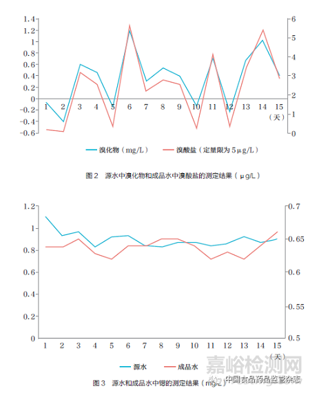 筆者通過實地調(diào)研進一步考察Br-濃度對溴酸鹽的影響。通過調(diào)研一家飲用天然礦泉水生產(chǎn)企業(yè),產(chǎn)品為富鍶礦泉水。該企業(yè)之前出現(xiàn)過溴酸鹽含量超標現(xiàn)象,為使溴酸鹽和微生物指標均合格,將O3 投量降到0.07mg/L,同時在管道上加裝了3 組紫外線滅菌裝置。連續(xù)15 天在同一時間段采集源水和成品水,檢測源水中溴化物、鍶的含量及成品水中溴酸鹽、鍶的含量和銅綠假單胞菌的結(jié)果。溴化物、銅綠假單胞菌、鍶和溴酸鹽的測定參考GB 8538—2022《食品安全國家標準 飲用天然礦泉水檢驗方法》[9]。