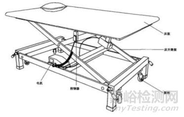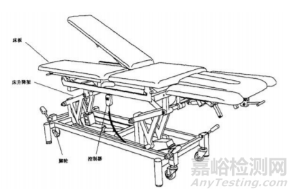 PT 康復(fù)訓(xùn)練床通常由床板、機械支撐部件、電動控制裝置、 固定保護(hù)裝置、腳輪等組成。具體產(chǎn)品結(jié)構(gòu)示意圖見圖1。