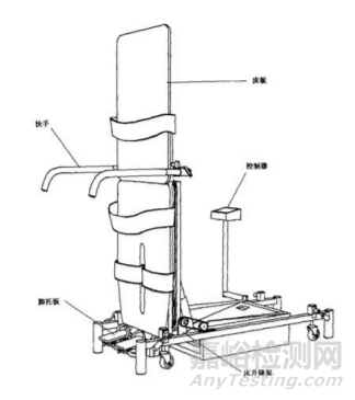 圖1 PT 康復(fù)訓(xùn)練床 直立康復(fù)訓(xùn)練床通常由床板、機械支撐部件、電動控制裝 置、固定保護(hù)裝置、扶手、腳輪、腳托板等組成。具體產(chǎn)品結(jié)構(gòu) 示意圖見圖2。