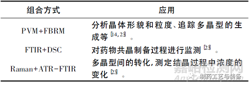 此外,聚焦光束反射測量(focused-beam reflectance measurement,F(xiàn)BRM) 儀、顆粒錄影顯微鏡技術(particle video microscope,PVM) 、衰減全反射傅立葉紅外變換紅外光譜(attenuated total reflection Fourier transformed infrared spectroscopy,ATR-FTIR) 儀、X-光吸收光譜(X-ray absorption spectroscopy,XAS) 、能量X-射線衍射(energy-dispersive Xray diffraction,EDXRD) 、在線透射電鏡(transmission electron microscopy,TEM) 等都可用于PAT,與質量評價類似,PAT也采用幾種方法相結合的方式,共同監(jiān)測結晶過程。組合方式及應用見表3。