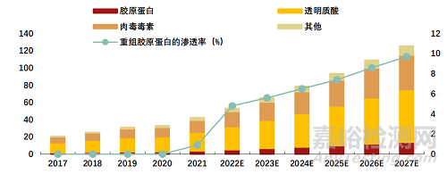Frost &Sullivan預(yù)測,重組膠原蛋白的注射類市場規(guī)模2022-2027年均復(fù)合增速有望達到36.5%(高于透明質(zhì)酸的17.9%和肉毒毒素的 18.2%),滲透率有望從2022年的4.8%提升至2027年的9.7%。
