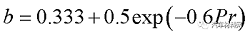 熱成形的摩擦因數(shù)一般在0.25~0.5之間,在熱成形過程中,空氣的對(duì)流換熱系數(shù)取0.024 mW/(mm2·℃)[17],接觸換熱系數(shù)[18]可以通過數(shù)值積分算出,模具與冷卻水表面的傳熱系數(shù)hCHTC根據(jù)Sleicher等[19]提出的流體傳熱模型計(jì)算,見式(2)。其中,指數(shù)a、b的值分別由式(3)、式(4)計(jì)算得到。
