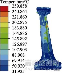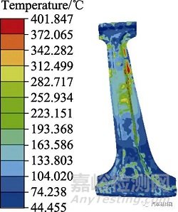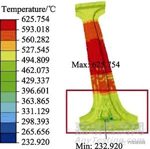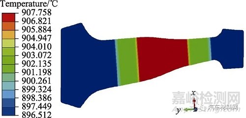 如圖17所示,成形件端部的應(yīng)力值分布不均勻,兩側(cè)應(yīng)力值大,中間應(yīng)力值小。這主要是因?yàn)槎瞬康臏囟炔痪鶆蛟斐傻?,在成形件兩?cè)不僅通過模具換熱,還通過熱輻射向四周散熱,如圖18所示,端部兩側(cè)的溫度比中心位置低,由此可見,在熱成形中,板材溫度的變化對(duì)熱成形的應(yīng)力分布有較大影響。