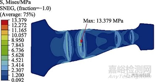 在溫度場(chǎng)中,中性層溫度與板料兩側(cè)的溫度幾乎相同,取更具代表性的中性層NT12進(jìn)行分析,得到的板材轉(zhuǎn)移后的溫度云圖如圖5所示。由圖5可以看出,板材厚度不同時(shí),在同等散熱條件下,較薄的區(qū)域溫度下降快,較厚的區(qū)域溫度下降慢,等厚區(qū)溫度幾乎相同,過渡區(qū)產(chǎn)生了溫度梯度,溫度的變化造成了內(nèi)應(yīng)力的變化,如圖6所示。在熱變形過程中,應(yīng)力對(duì)溫度的變化比較敏感,所以溫差較大的過渡區(qū)產(chǎn)生了比較明顯的應(yīng)力集中,應(yīng)力最大處為13.379 MPa,此處為定位約束的位置,對(duì)后續(xù)的成形結(jié)果不會(huì)產(chǎn)生太大影響。