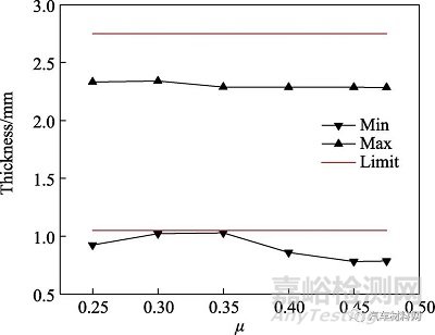 圖7 不同摩擦因數(shù)下制件的厚度變化