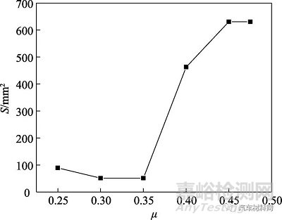 在板材沖壓成形過程中,摩擦力作為一種阻力,會(huì)影響材料流動(dòng)[21],為研究摩擦因數(shù)對(duì)成形的影響規(guī)律,利用單因素法,在成形速度為100 mm/s時(shí),取6組不同的摩擦因數(shù)μ(0.25、0.3、0.35、0.4、0.45、0.475)進(jìn)行模擬。通常認(rèn)為,變薄率小于25%時(shí)制件不會(huì)出現(xiàn)破裂和起皺的缺陷,即厚度在1.05~ 2.75 mm之間是合格的。圖7為不同摩擦因數(shù)下模擬結(jié)果的最值與判定標(biāo)準(zhǔn)的比較圖,由圖7可以看出,增厚均未超過起皺上限,但減薄比破裂的下限值略低。對(duì)不同摩擦因數(shù)下破裂部分的面積進(jìn)行分析,如圖8所示,當(dāng)摩擦因數(shù)大于0.35時(shí),破裂區(qū)的面積大幅增加;當(dāng)摩擦因數(shù)小于0.35時(shí),破裂區(qū)面積減小。綜合考慮面積和最小厚度2個(gè)因素,認(rèn)為熱成形中的摩擦因數(shù)不應(yīng)超過0.35。