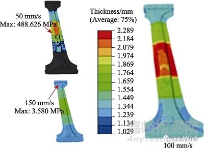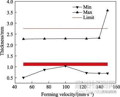 Fig.9 Thickness diagram of simulation results with different forming velocity
