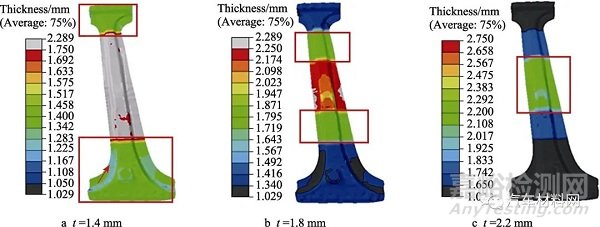 對(duì)板材成形來說,減薄量是衡量成形性能的重要評(píng)判標(biāo)準(zhǔn)[23],基于得到的工藝參數(shù)(摩擦因數(shù)0.35、成形速度100 mm/s)對(duì)B柱的成形階段進(jìn)行數(shù)值模擬,其結(jié)果如圖11所示,分別以1.4、1.8、2.2 mm的破裂和起皺值為基準(zhǔn)設(shè)置云圖上下限。