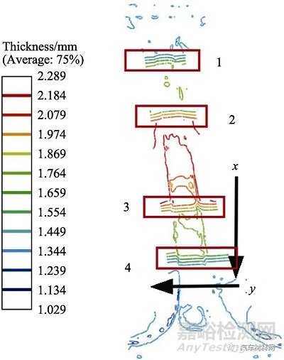 圖12 成形后厚度等值線圖和坐標(biāo)方向