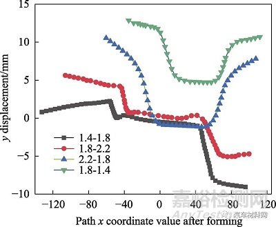 變厚板與普通等厚板不同,板材上除了等厚區(qū)外,還有厚度過渡的過渡區(qū)。研究過渡區(qū)位置的偏移變化對(duì)研究成形過程中材料的流動(dòng)具有重要意義。通過觀察4個(gè)過渡區(qū)沿x、y方向的位移來確定成形過程中材料運(yùn)動(dòng)的大致趨勢(shì),由圖12可以看出,成形后厚度等值線發(fā)生了一些波動(dòng),選取過渡區(qū)路徑上的等值線,得到的偏移量如圖13所示。由圖13可以看出,過渡區(qū)4整體向y方向移動(dòng),過渡區(qū)1、2向x負(fù)向和y正向偏移,過渡區(qū)3向y向正向偏移。根據(jù)模擬結(jié)果,可以適當(dāng)調(diào)節(jié)板材等厚區(qū)長度,提高板材的成形質(zhì)量。