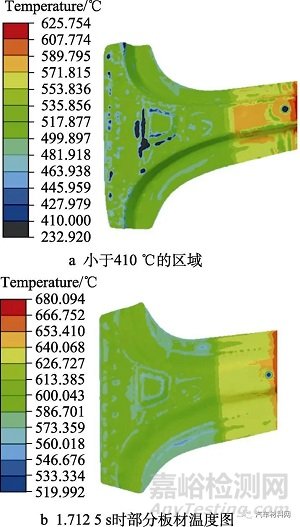 Fig.14 Comparison of temperature change: a) areas with temperatures less than 410 °C; b) temperature diagram of part of the plate at 1.712 5 s