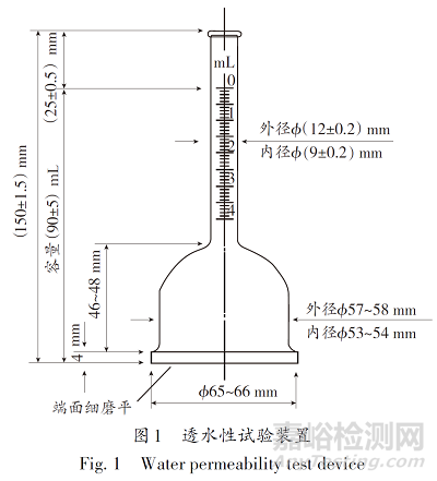 三級實驗用水:自制;線棒涂布器(規(guī)格為80、120):上?,F(xiàn)代儀器;無石棉纖維水泥平板(A、B、C,430 mm×150 mm×6 mm):A公司、B公司、C公司;測試涂料:合格品、一等品、優(yōu)等品(3種涂料均通過常州涂料化工研究院外檢確認透水性符合對應等級);外墻膩子(D、E,符合JG/T 157—2009的要求):D公司、E公司。帶刻度的漏斗狀玻璃裝置:容量(95±5)mL;上部玻璃管帶有4 mL刻度,最小分度值為0.1 mL;底盤直徑為65~66 mm,經(jīng)磨砂處理,如圖1所示。