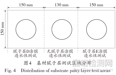使用2種測試膩子(D、E)分別在3種無石棉纖維水泥平板上指定位置(150 mm×150 mm)批涂2遍,每遍上料30 g;養(yǎng)護干燥2 d后,使用一等品外墻涂料在樣板上制膜養(yǎng)護后進行透水性測試,方法同涂膜透水性測試,指定位置參照圖4。