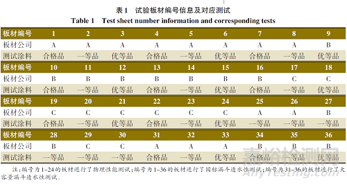 A、B 2 種無石棉纖維水泥平板各取3 塊,編號31~36。使用3種測試涂料分別在2種不同試驗板材上進行涂覆及養(yǎng)護,試驗板材與測試涂料的對應關系如表1所示。