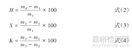 根據(jù)GB/T 7019—2014《纖維水泥制品實驗方法》的規(guī)定,測試試驗板材的表觀密度ρ、含水率H、吸水率X 及孔隙率K,如式(1)~(4)所示。