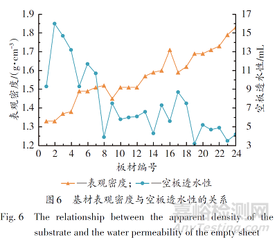 分析圖6可以發(fā)現(xiàn),基材表觀密度與空板透水性呈現(xiàn)一定的負相關性,即表觀密度越大,空板透水性越低。筆者認為基材的表觀密度一定程度上會影響空板透水性。