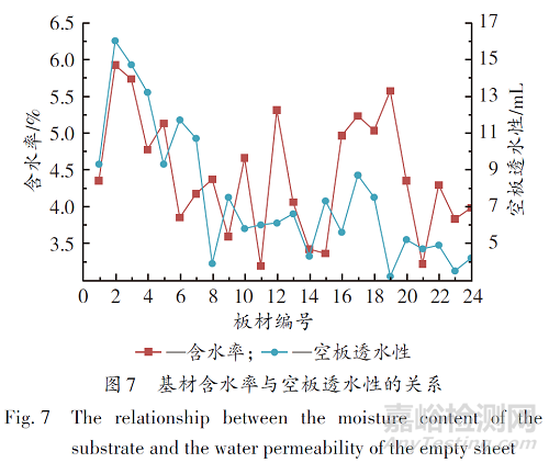 由圖7可知,基材含水率分布在3%~6%,含水率與空板透水性無明顯關系。以試驗板材10、11、12為例,這3 塊板材密度相同,但含水率分別為4. 66%、3.19%和5.31%,差異明顯,對應的空板透水率分別為5.8 mL、6.0 mL、6.1 mL,無明顯相關性,因此認為基材的含水率對空板透水性無明顯影響。
