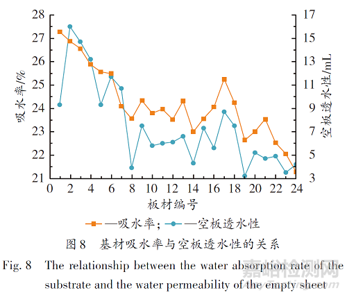 由圖8可知,基材吸水率均小于JC/T 412.1—2006要求的28%,但差異明顯,分布在21%~28%,與空板透水性有一定程度的正相關,這可能是基材的吸水率對空板透水性有明顯影響,即基材吸水率越高,空板透水越多;反之,基材吸水率降低,空板透水也降低。