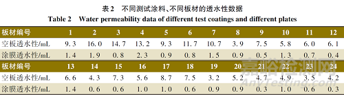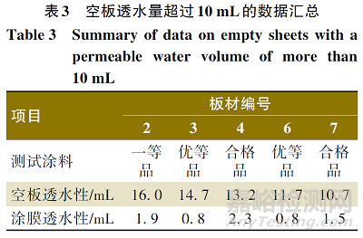由以上結果可知,產(chǎn)品透水性測試結果受板材差異影響極大,表觀密度大、空板透水少的板材測試結果明顯優(yōu)于空板透水多的板材,進一步表明實驗板材對涂料透水性測試結果的影響不可忽視。