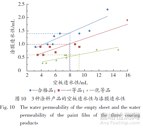 進一步研究空板透水性與不同等級涂料涂膜透水性的關系,結果如圖10所示。