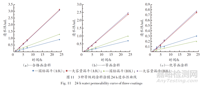 由圖11(a)、(b)可知,合格品涂料和一等品涂料在使用國標漏斗時,A板上的24 h透水數(shù)據(jù)比B板上的小,而在使用大容量漏斗時,A板與B板上的透水數(shù)據(jù)接近。盡管合格品涂料與一等品涂料均符合國標相應等級指標要求,但在A 板和B 板上有明顯差異;而在使用大容量漏斗時,受大容量漏斗放大效應的影響,2種板材上的透水數(shù)據(jù)接近。