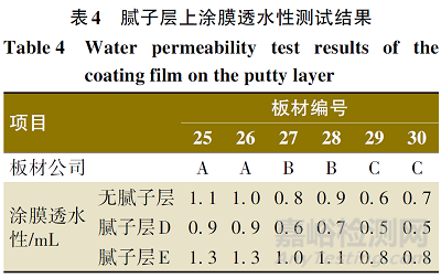 對于增加膩子層對涂膜透水性的影響需要更深入的研究,例如使用什么型號的膩子,批刮膩子的致密程度、上料量以及厚度等因素都需要進一步的實驗確定。