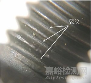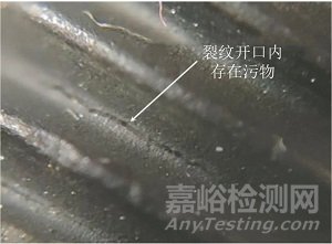 采用60倍放大鏡觀察19件螺栓試件表面情況,發(fā)現(xiàn)19件螺栓試件在倒數(shù)第一扣至倒數(shù)第三扣根部均存在不同數(shù)量的裂紋,如圖2所示,裂紋開口大小存在差別。部分試件裂紋開口內(nèi)存在污物堵塞,如圖3所示。