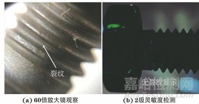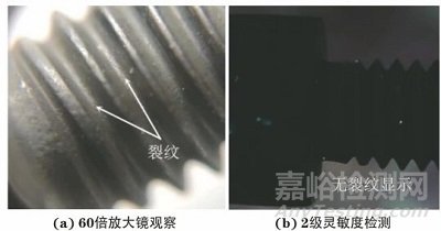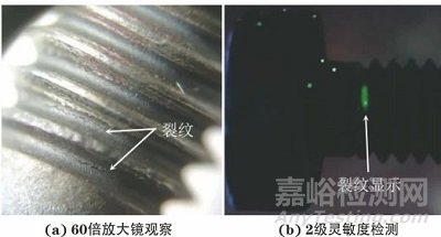 經(jīng)過分析,認為該螺栓螺紋根部裂紋的產(chǎn)生原因是工作環(huán)境冷熱變換產(chǎn)生了應(yīng)力。觀察該螺栓的表面,發(fā)現(xiàn)螺紋中存在一定量的燒結(jié)物、積碳、氧化皮等雜質(zhì),這些雜質(zhì)掩蓋了表面開口裂紋;且粗糙的氧化皮表面附著大量滲透液,造成檢測過程中對比度降低,難以發(fā)現(xiàn)裂紋顯示,尤其是細微裂紋顯示。另外某些開口裂紋的深寬比較小,采用中等靈敏度滲透液無法檢出。