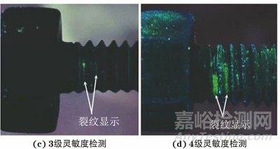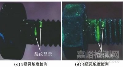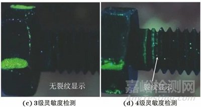 采用2級靈敏度進行熒光滲透檢測時裂紋顯示為1條,倒數(shù)第一扣裂紋顯示長度約為1.4 mm,滲透液回滲明顯,檢測背景較好;采用3級靈敏度檢測時裂紋顯示為2條,倒數(shù)第一扣裂紋顯示長度約為2.0 mm,倒數(shù)第二扣裂紋顯示約為1.1 mm,裂紋顯示處滲透液回滲明顯,檢測背景較好;采用4級靈敏度檢測時裂紋顯示2條,倒數(shù)第一扣裂紋顯示長度約為4.8 mm,倒數(shù)第二扣裂紋顯示約為1.2 mm,裂紋顯示處滲透液回滲明顯,但檢測背景稍差,如圖7所示。