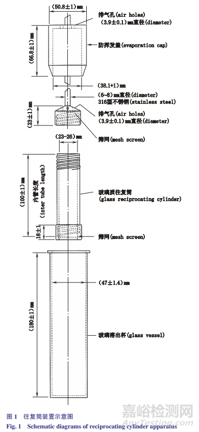 在測(cè)定過程中,將裝有溶出介質(zhì)的圓柱形溶出杯置于恒溫水浴中,將樣品放置在玻璃往復(fù)筒中,篩網(wǎng)裝在往復(fù)筒頂部和底部,然后將塑料帽與金屬棒連接,置于大小合適且保持在37℃±0.5℃水浴的玻璃容器中,并使往復(fù)筒在溶出杯中做浸入與浸出溶出介質(zhì)的往復(fù)運(yùn)動(dòng),透過篩網(wǎng)流經(jīng)圓筒的溶出介質(zhì),在藥物的溶出過程中提供了液-固界面剪切力。